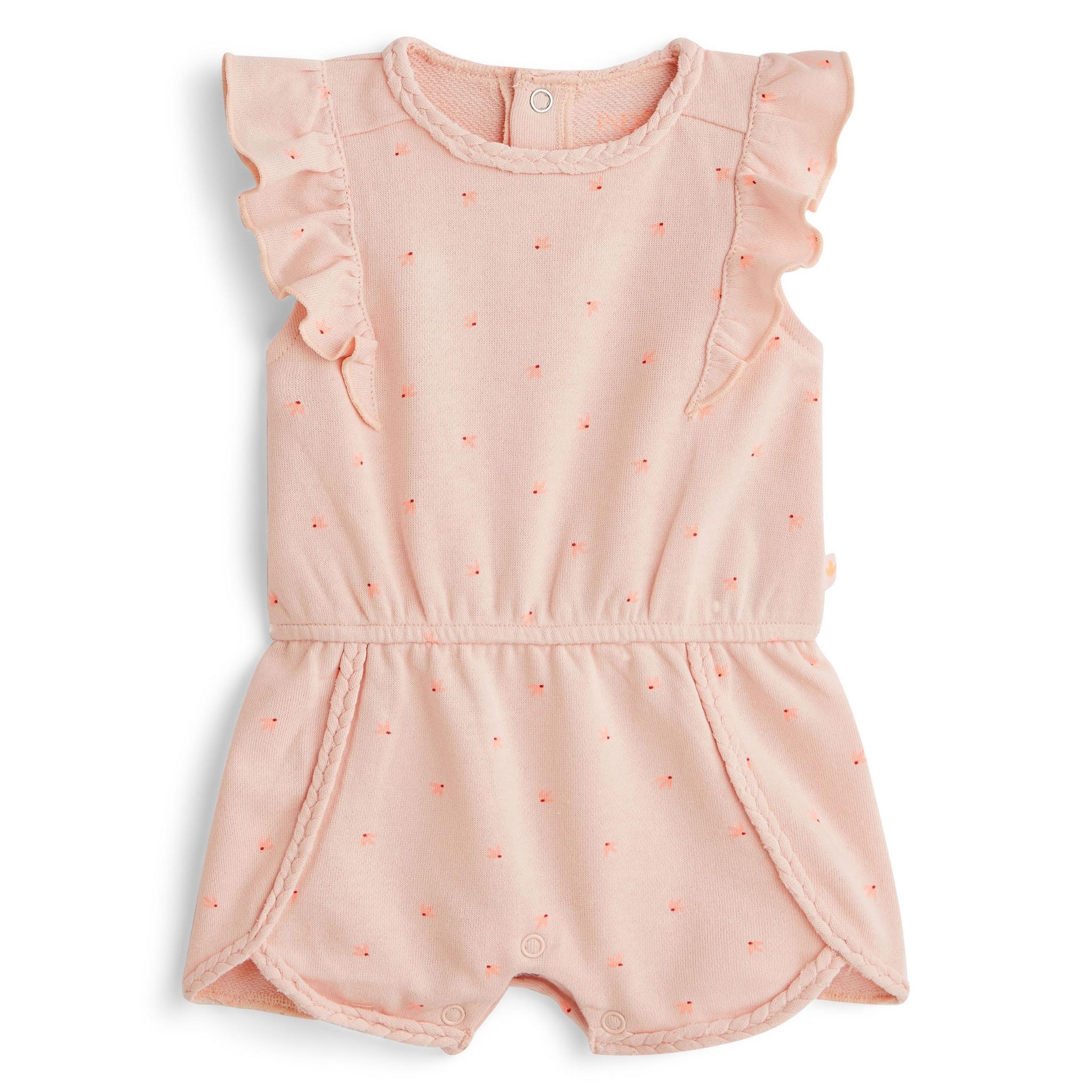Style girly et romantique pour bébé fille avec cette combinaison en molleton léger ! Animée d'un délicat imprimé fantaisie, elle se démarque par ses manches volantées ainsi que ses finitions tressées ton sur ton. Afin de simplifier l'habillage, cette combinaison possède une ouverture pressionnée au