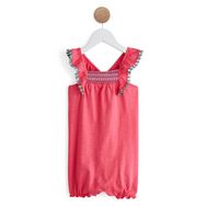 C?est l?été avec ce combicourt souple et doux en coton flammé, son jeu de smocks multicolore et ses bretelles volantées ! On craque pour la couleur très franche et la jolie finition pompons à frange très estivale sur les bretelles. Ce combicourt possède une ouverture pressionnée à l?entrejambe.