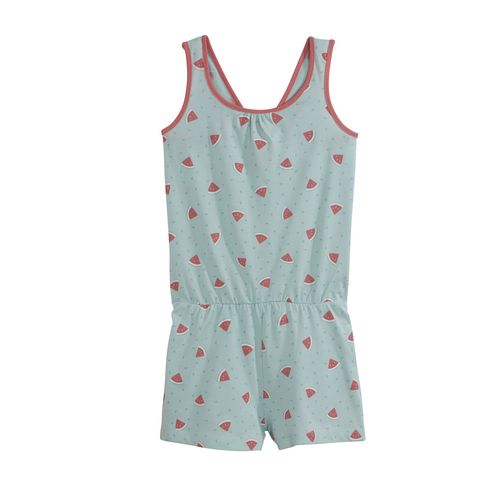 Ce combishort fille est à croquer ! On adore ses détails fantaisie et son imprimé "pastèques". Il est réalisé en coton. Le combishort fille est léger et confortable, il dispose d'un nœud fantaisie en haut du dos et d'une taille élastiquée. On note les fronces sous l'encolure. Un vêtement