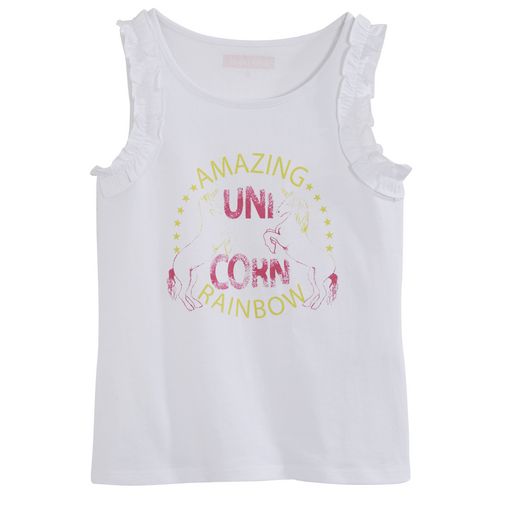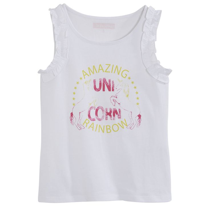 Coup de cœur pour ce débardeur fille orné de petits volants ! On aime : l'imprimé "licornes" et les volants fantaisie placés au niveau des emmanchures. Il est agréable à porter et léger. Il n'y a pas d'étiquette dans le cou pour plus de douceur. Ce débardeur fille est facile d'entretien.