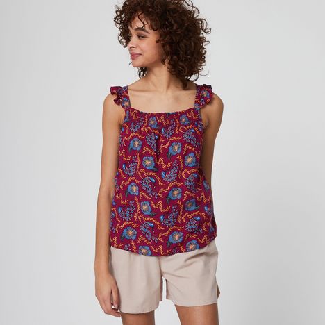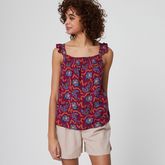 Bretelles volantées, col froncé, imprimé estival et dos plongeant font de ce top un des must de l'été à ne pas manquer !