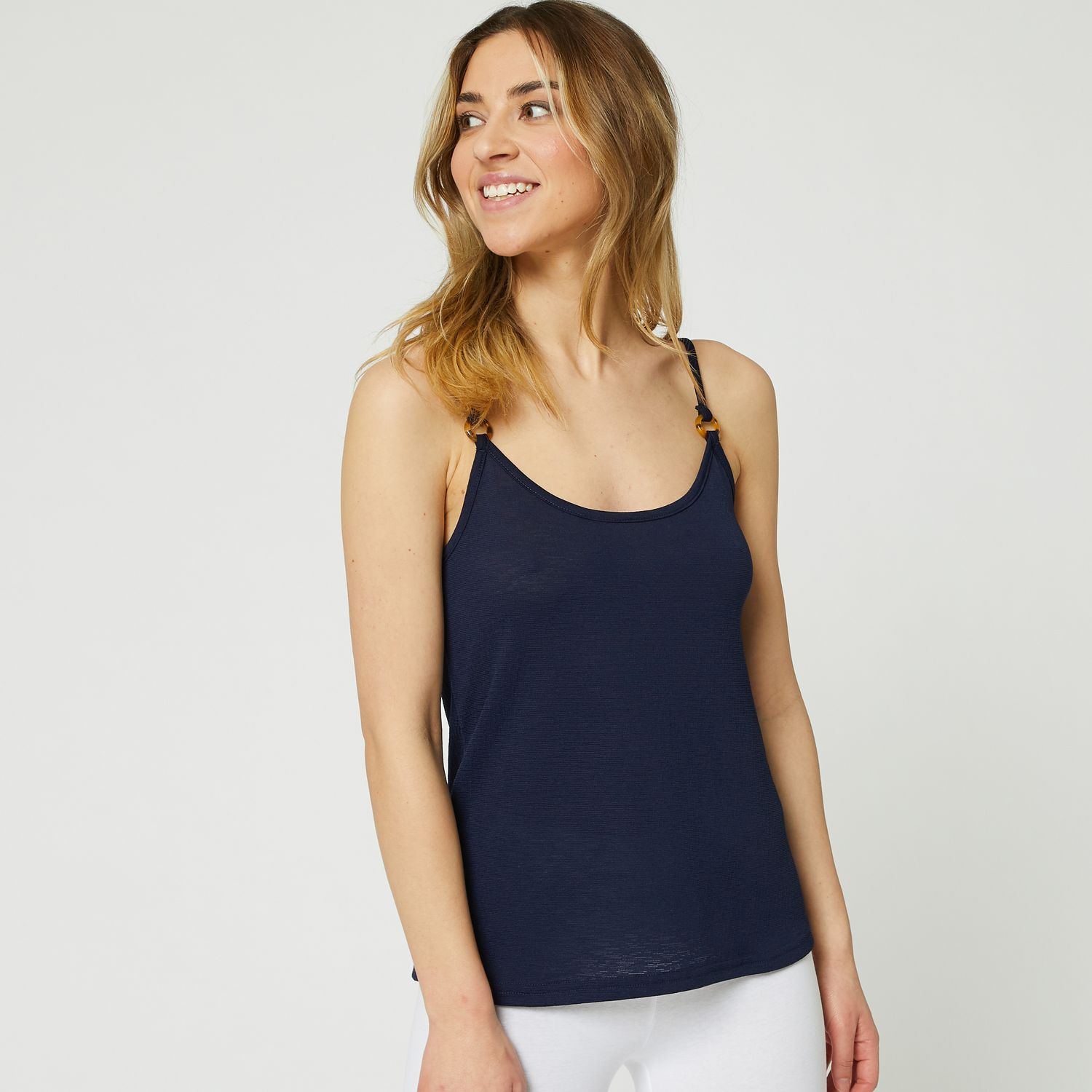 En savoir +Un classique revisité ce débardeur à fines bretelles avec ses anneaux aux boucles et son effet crépon.