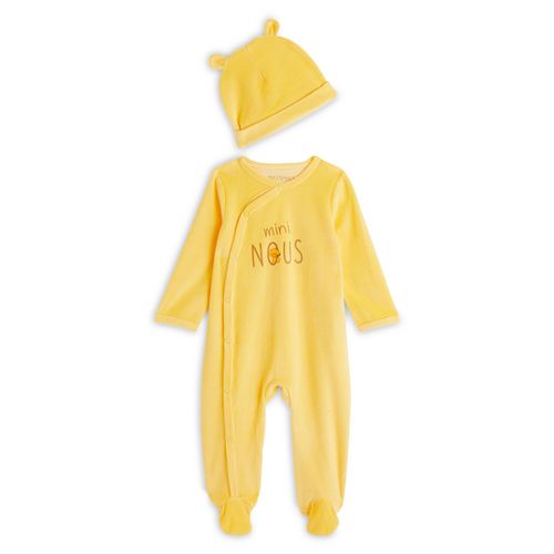 Bébé sera à croquer dans ce dors bien en velours tout doux imprimé d’un petit chat plein d'amour et de l'inscription "mini NOUS" ! Il possède une ouverture par pressions sur le devant pour un change et un habillage facile. Ce dors-bien est associé avec un joli bonnet fantaisie pour maintenant