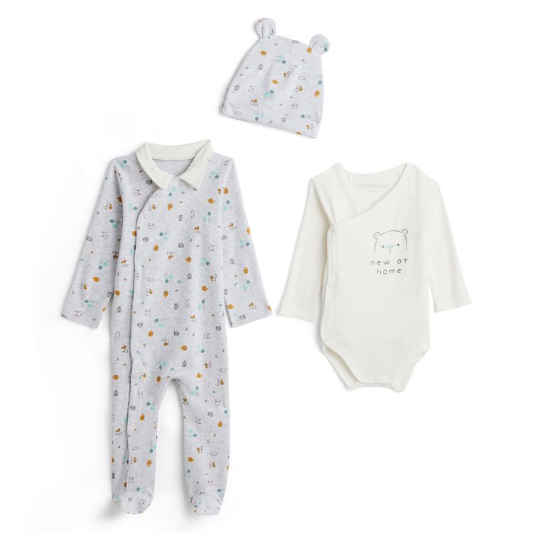 Cet ensemble 3 pièces trop mignon et apporte confort et douceur à bébé. Il est composé d'un dors-bien avec un joli col chemise et une ouverture pressionnée devant, d'un body croisé à manches longues, et d'un bonnet à croquer avec deux oreilles en relief. On adore les imprimés animaux carrément adora
