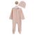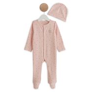 En route pour le pays des rêves avec cet ensemble dors-bien et bonnet en jersey de coton bio tout doux imprimés de petites feuilles avec un félin trop mignon placé sur la poitrine ! Le dors-bien possède une ouverture intégrale par pressions sur le devant et à l’entrejambe pour un change et un