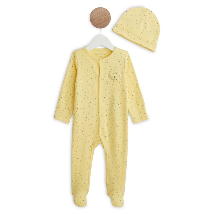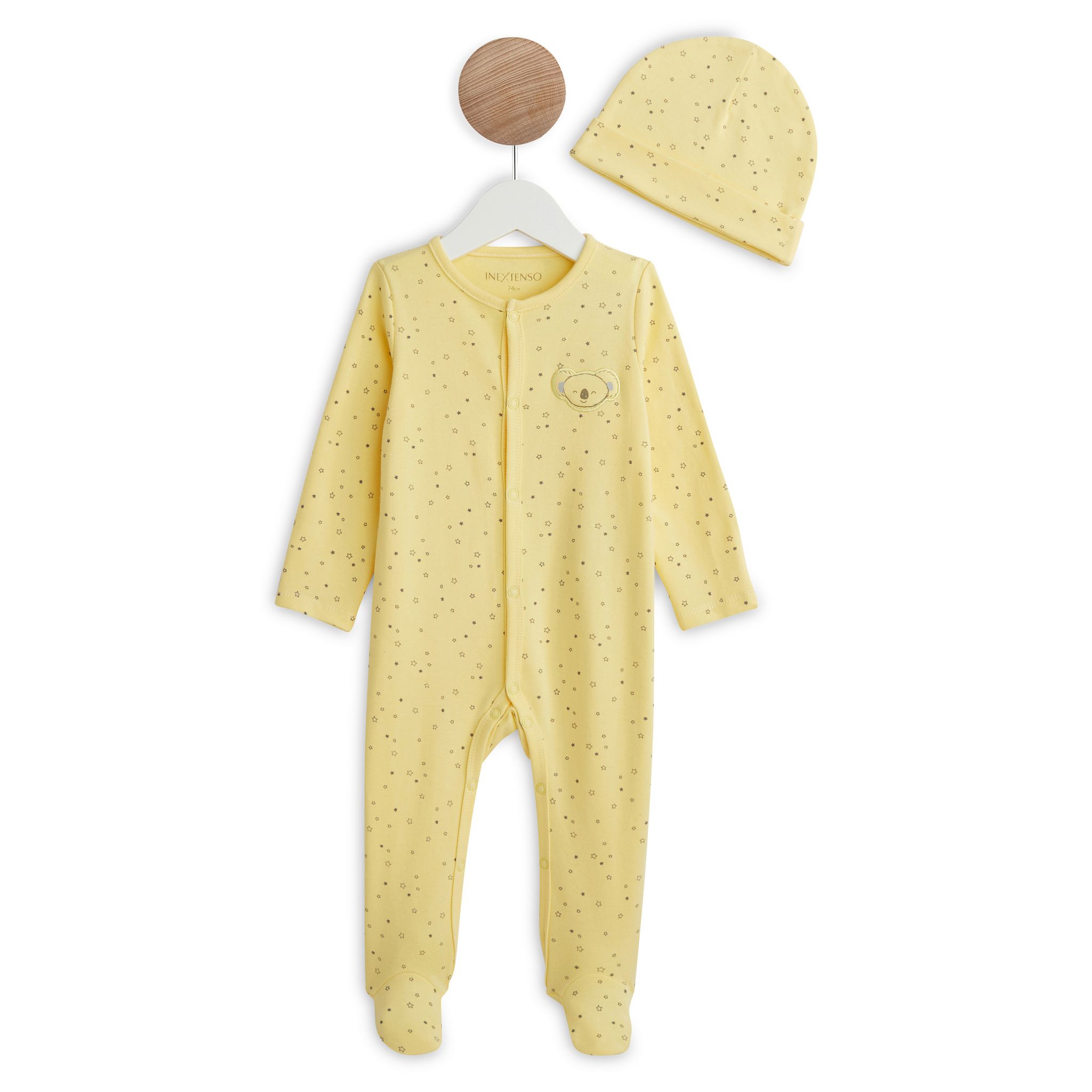 En route pour le pays des rêves avec cet ensemble dors-bien et bonnet en jersey de coton bio tout doux imprimés d’étoiles avec un koala trop mignon placé sur la poitrine ! Le dors-bien possède une ouverture intégrale par pressions sur le devant et à l’entrejambe pour un change et un habi