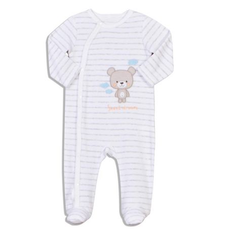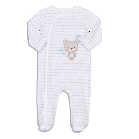 Ce dors-bien se fait tout doux et tout confort pour que bébé dorme à poings fermés ! Velours lisse très doux, imprimé rayé. Ouverture complètement pressionnée sur le devant. Broderie fantaisie. Ce pyjama bébé est lavable en machine à 40°.