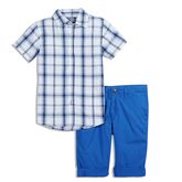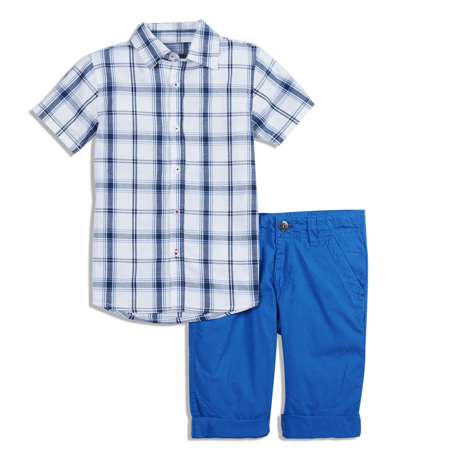Cet ensemble chemise et bermuda garçon annonce de belles journées ensoleillées ! Confortable. 100% coton. Chemise à manches courtes, imprimé carreaux, ouverture boutonnée, base légèrement arrondie. Bermuda : élastique et boutons intérieurs pour une taille bien réglée, ouverture par bouton et zip, 2