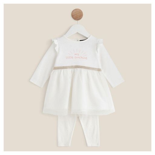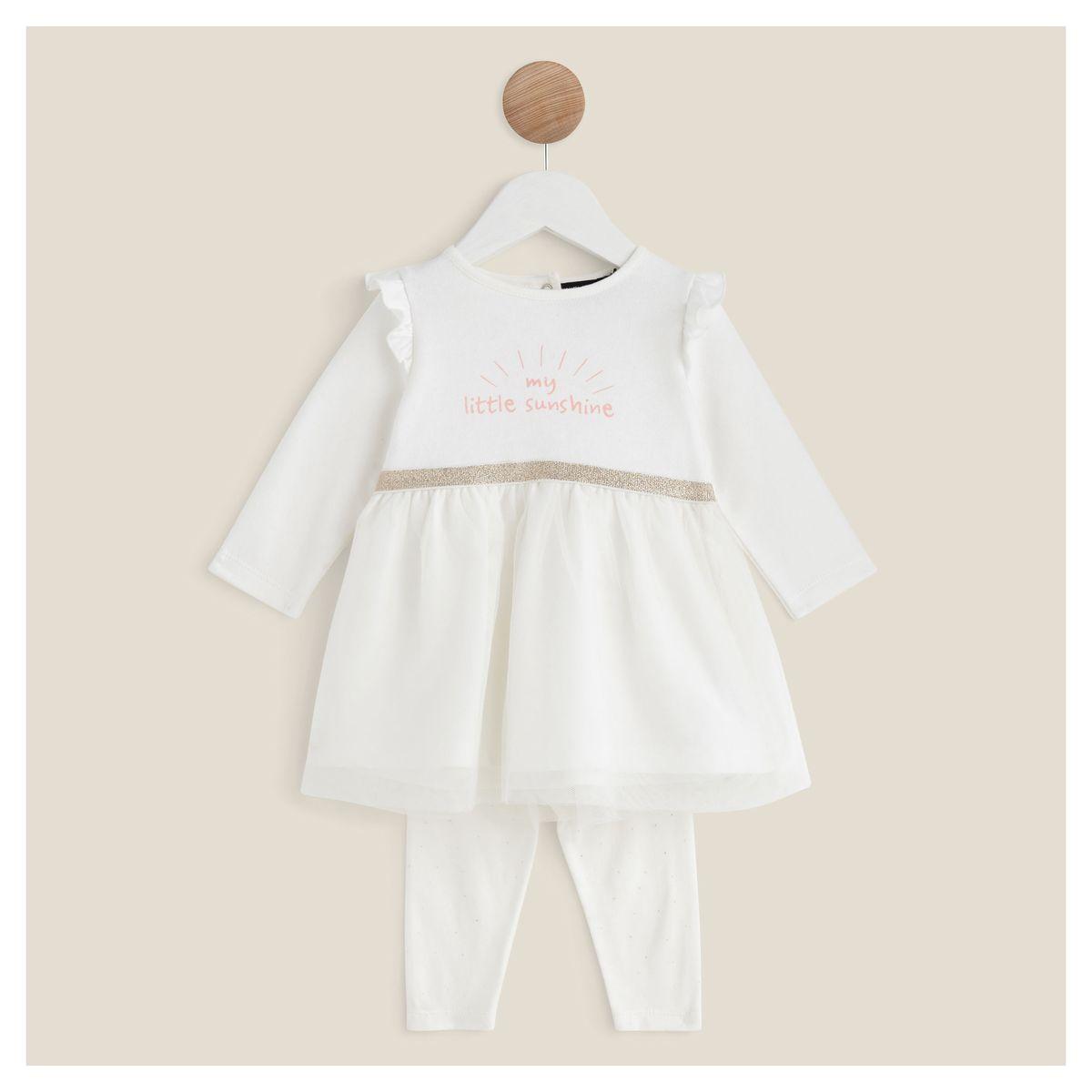En savoir +Cette ensemble 3 pièces est une vraie tenue de fêtte pour notre petite princesse ! Un brin féérique, la tunique est rehaussée de tulle et d'un ruban doré à la ceinture. Elle est pressionnée dans le dos pour un enfilage facile. Le legging doux et confortable est parsemé de micro points pailletés, et le bandeau assorti se pare d'une fleur en tulle délicat.