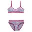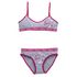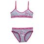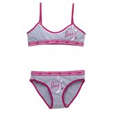 Pour les petites filles et les jeunes ado, voici un charmant ensemble de lingerie gris chiné. Pour le haut, une brassière avec la basque bien élastique. Joli imprimé avec effet scintillant. Petite bande de tissu contrastante au niveau du décolleté. En bas, une jolie culotte bien confortable avec cou