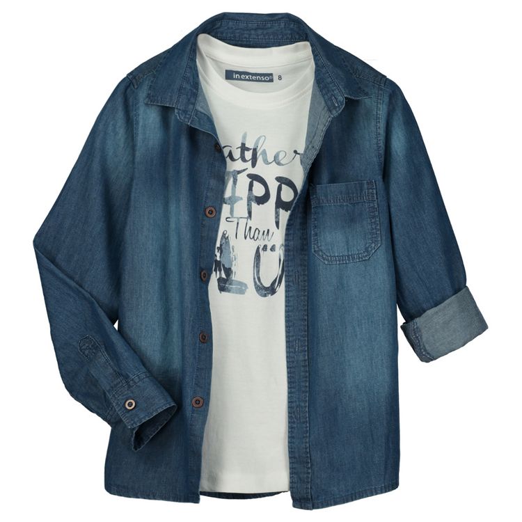 A porter ensemble ou séparément : l'ensemble chemise en jean et tee-shirt garçon. Confortables. 100% coton. Tee-shirt : imprimé sur le devant, col rond, manches courtes. Chemise en jean : effet délavé par endroit, ouverture boutonnée, 1 poche sur la poitrine, manches longues, base légèrement arr