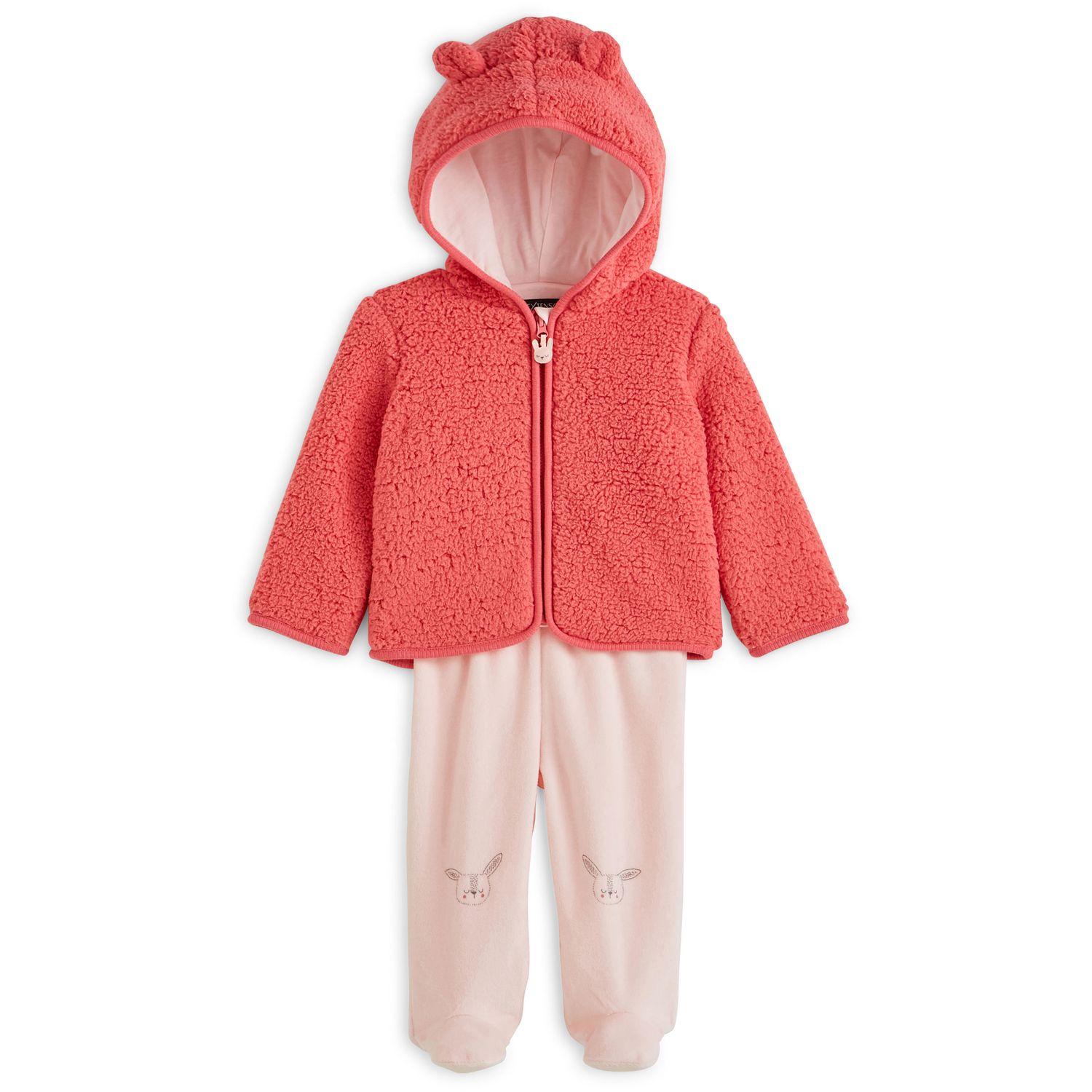 Qu'il est mignon cet ensemble tout doux avec sa veste en sherpa et son pantalon à pieds hyper confortable ! La veste toute chaude comporte une capuche avec de petites oreilles en relief et une fermeture zippée devant. Le pantalon à pied, élastiqué à la taille, affiche un tendre motif lapin imprimé