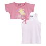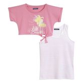 Cet ensemble débardeur et tee-shirt court fille plaira par son côté girly ! Agréables à porter. 100% coton. Débardeur rayé. T-shirt court : lien à nouer à la base, imprimé avec légères paillettes sur le devant, col rond, manches courtes avec revers cousus. Cet ensemble débardeur et t shirt fille est