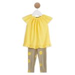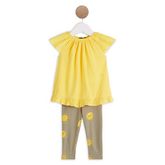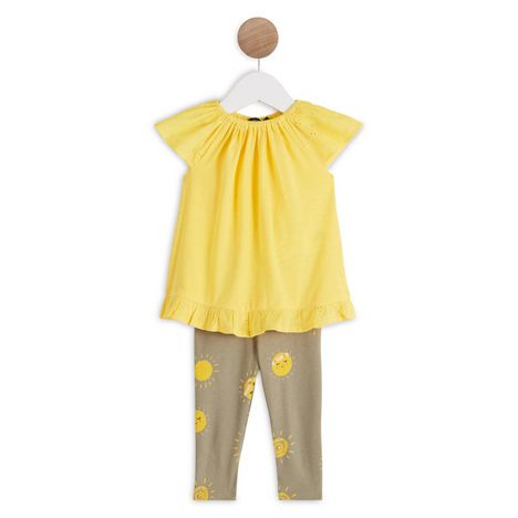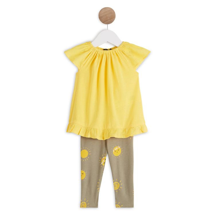 Cet ensemble top et legging en 100% coton est carrément à croquer ! Le top possède des manches raglan courtes forme papillon et son ourlet à basque en broderie anglaise. Le legging est parsemé d'un imprimé soleil qui donne bonne mine à bébé.
