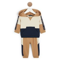 En savoir +Cet ensemble 2 pièces en molleton colorblock est carrément craquant et stylé ! Le sweat présente un adorable message imprimé le long des manches. Il possède une capuche et une poche kangourou. Le pantalon dispose d’une taille élastiquée pour le confort de bébé.