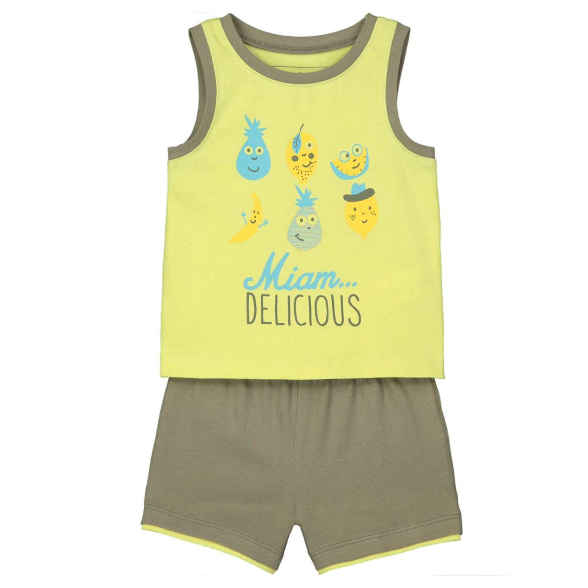 En savoir +Bébé est prêt pour la belle saison avec cet ensemble débardeur & short ! 100% coton. Léger et agréable à porter. Débardeur : imprimé coloré sur le devant, bords contrastés, il n'y a pas d'étiquette dans le cou pour un confort total. Short : taille élastiquée, effet 2 en 1 à la base. Cet ensemble été bébé garçon est lavable en machine à 40°.