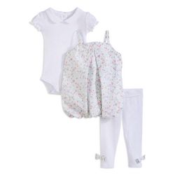 Votre toute petite est prête pour la belle saison avec cet ensemble robe, body et legging bébé ! 100% coton. Robe boule : imprimé "fleurs", entièrement doublée, ouverture pressionnée sur les côtés, bretelles ajustables, base élastiquée, jeu de plis. Body col claudine : maille coton finement côtel