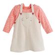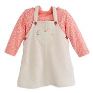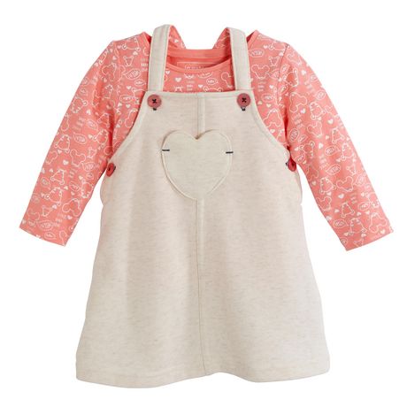 On craque pour cet ensemble robe en molleton et tee-shirt bébé fille. La robe possède des bretelles boutonnées, une ouverture boutonnée sur les côtés, une poche en forme de cœur, on note la découpe sur le devant. Le t-shirt bébé fille est imprimé en all-over, il offre un col rond et des manc
