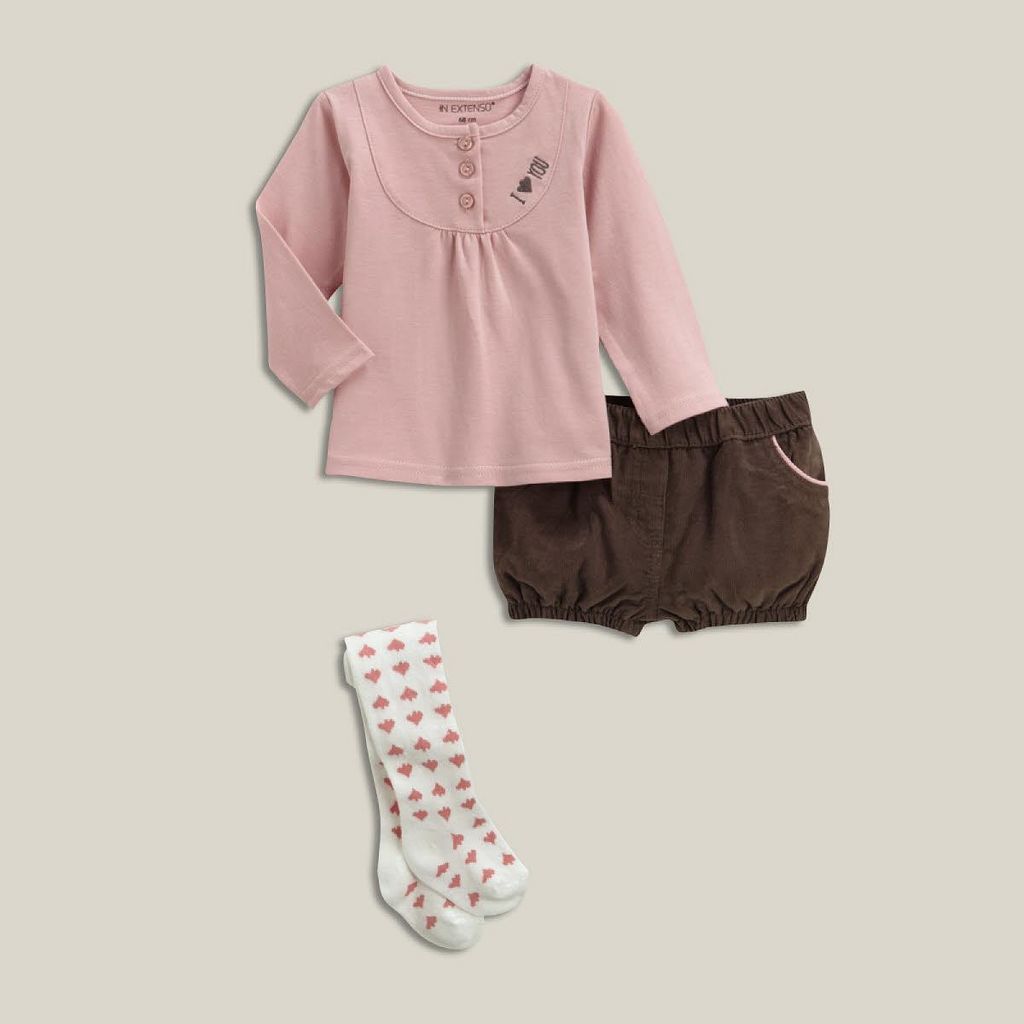 Trop craquante cette tenue bébé composée d'un tee-shirt, d'un short et d'une paire de collants. Agréable à porter. Tee-shirt 100% coton, col rond, manches longues, patte boutonnée, broderie fantaisie, jeu de fronces sur le devant. Short en velours finement côtelé, taille élastiquée, 4 poches, base é