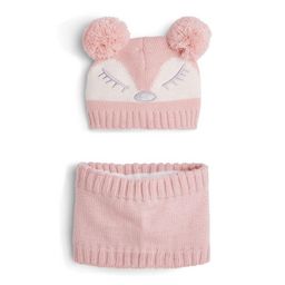 Trop mignon, cet ensemble pour bébé fille se compose d?un joli bonnet animal en tricot orné d?oreilles et de motifs fantaisie, et d?un tour de cou douillet. Tous deux sont rehaussés de fil lurex pour la touche mode, et doublés de maille polaire pour un supplément de chaleur et de douceur !