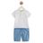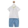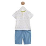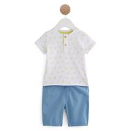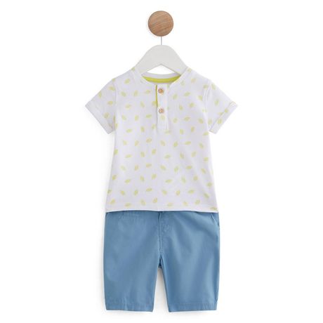 Voilà un ensemble trop mignon que bébé garçon pourra porter tout l'été ! Le T-shirt col tunisien à manches courtes se pare d'un adorable imprimé fantaisie qui charmera les mamans à coup sûr. Afin de procurer un total confort et une parfaite liberté de mouvement à bébé, le short est doté d'une taille élastiquée.