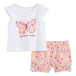 Coloré et léger, cet ensemble tee-shirt et short bébé est parfait pour la belle saison. Agréables à porter. T-shirt : manches animées de petits volants, col rond, papillon appliqué et broderie fantaisie sur le devant, pas d'étiquette dans le cou pour un confort complet. Short à pois : matière légère
