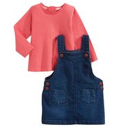 On craque pour cet ensemble bébé fille composé d'un tee-shirt et d'une robe en jean. Agréable à porter. Tee-shirt : uni, ouverture pressionnée en haut du dos, col rond, manches longues. Robe salopette : réalisée en denim, doublée en haut pour le confort, bretelles pressionnées ajustables, ouverture pressionnée sur les côtés, 2 poches, effet usé volontaire, patchs placés. Cet ensemble t-shirt et robe en jean bébé fille est lavable en machine à 40°.