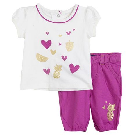 Cap sur les beaux jours avec cet ensemble 2 pièces bébé fille : tee-shirt & bermuda. Agréable à porter. 100% coton. Tee-shirt : col rond, manches courtes avec petites fronces, animation sur le devant avec motifs imprimés et appliqués, il n'y a pas d'étiquette dans le cou pour un maximum de confort. Bermuda : léger et confortable, taille élastiquée, motif brillant en bas, bas de jambe élastiqués, jeu de surpiqûres. Cet ensemble bébé fille est lavable en machine à 40°.