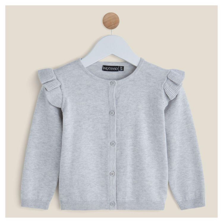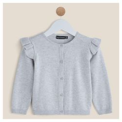 Un cardigan plein de charme qui va enchanter bébé fille et maman ! Confectionné en maille chinée, il présente des volants sur épaules totalement craquants. Le cardigan bébé fille possède une ouverture boutonnée sur le devant, un col rond et des manches longues. On note les finitions bord-côtes.