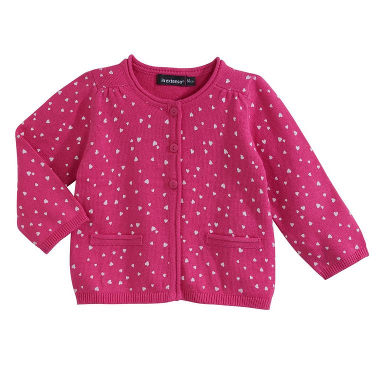 Ce gilet apporte de la couleur dans le dressing de bébé : on craque. Imprimé "coeur" en all-over. Maille fine et douce, 100% coton. Ouverture boutonnée en haut du gilet. Col rond, manches longues. Finition roulottée. Bords-côtes. Empiècements imitant les poches. Petites fronces sur les épau