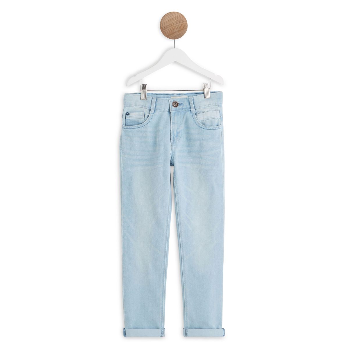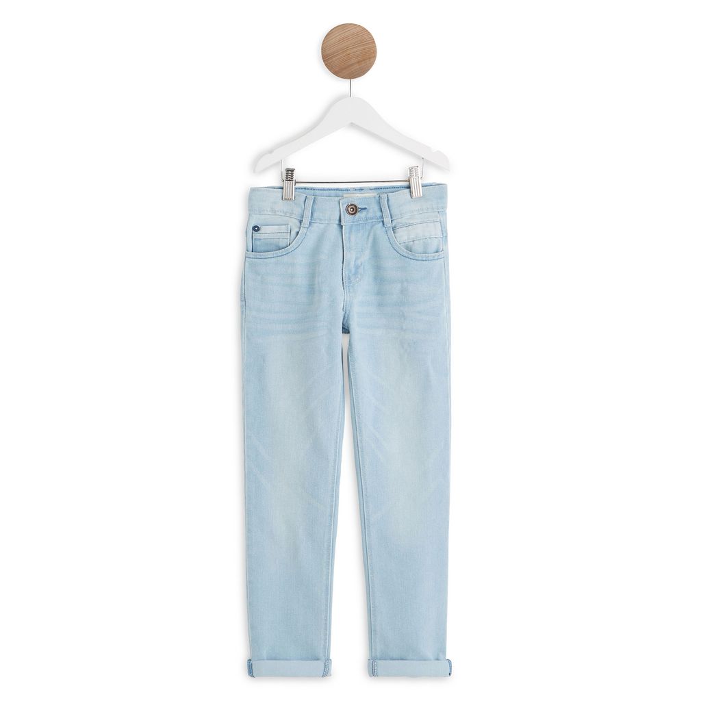 Indispensable dans le dressing des garçons, ce jean bleached est super confort avec sa toile délavée au coloris très frais. Il se porte avec des revers pour un look cool et tendance.