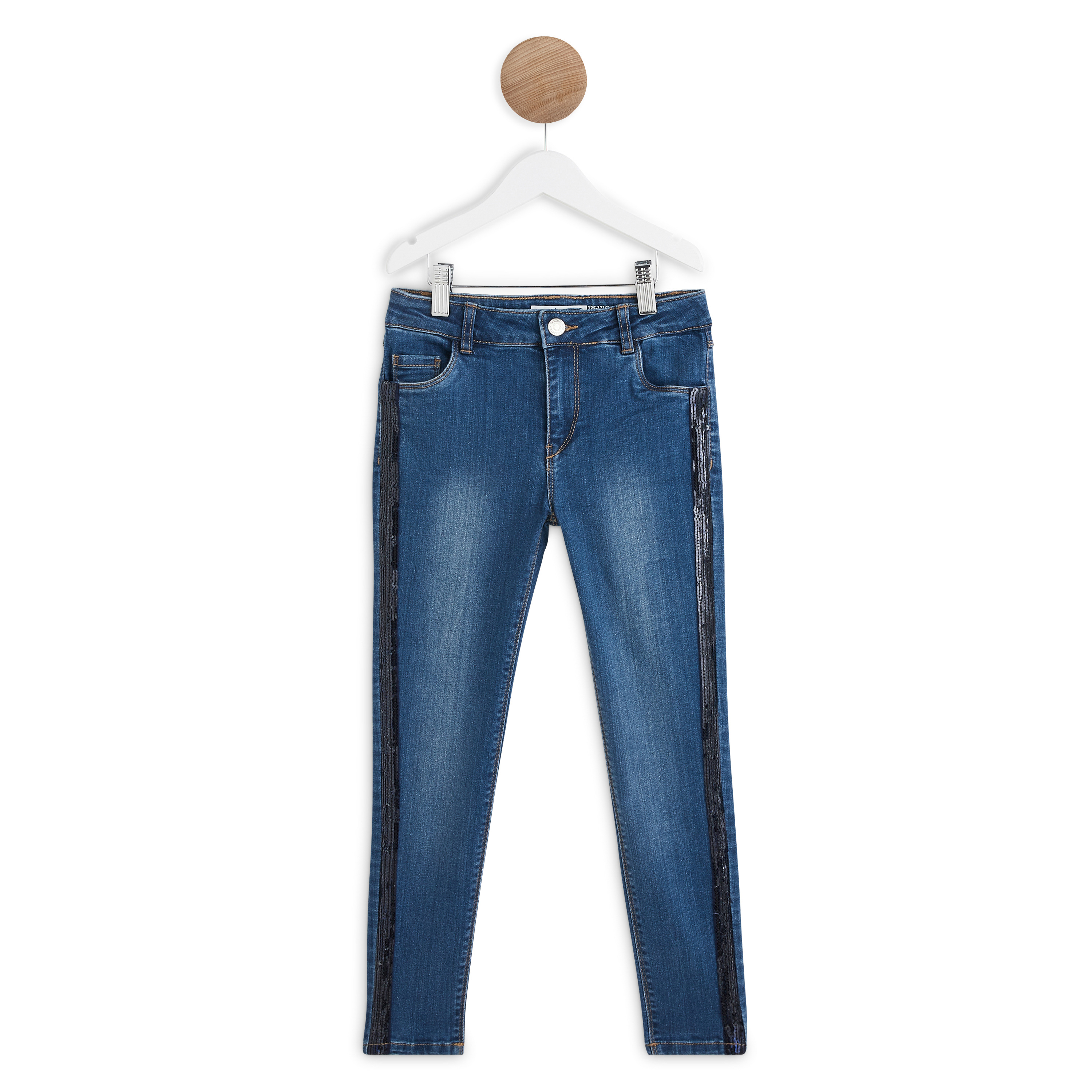 En savoir +Difficile de résister à ce jean slim en denim brut, véritable pièce stylée de la saison. Confortable à porter, ce modèle à sequins séduit par ses atouts mode et possède une ligne 5 poches, une fermeture par zip et bouton métal.