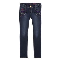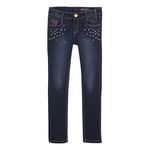 Un jean skinny avec des fleurs brodées, ça plaît terriblement aux filles ! Denim stone, agréable à porter. Aspect délavé par endroits. Taille ajustable de l'intérieur par élastique et boutons. Ouverture par bouton et zip. 5 poches. Fleur brodée sur une poche au dos. Jeu de surpiqûres. Ce jean fi
