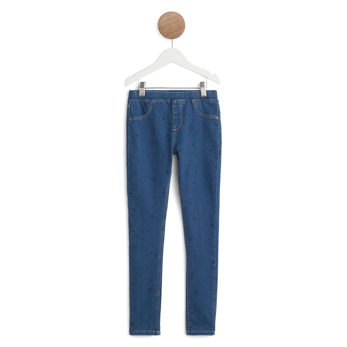 On renouvelle les tenues quotidiennes des filles avec ce jegging en denim imprimé ! Il est idéal pour des tenues cool et confortables. On aime : le petit motif étoiles fantaisie et les surpiqûres imitant les poches et la braguette devant. Ce jegging fille possède une large taille élastiquée et 2 poc
