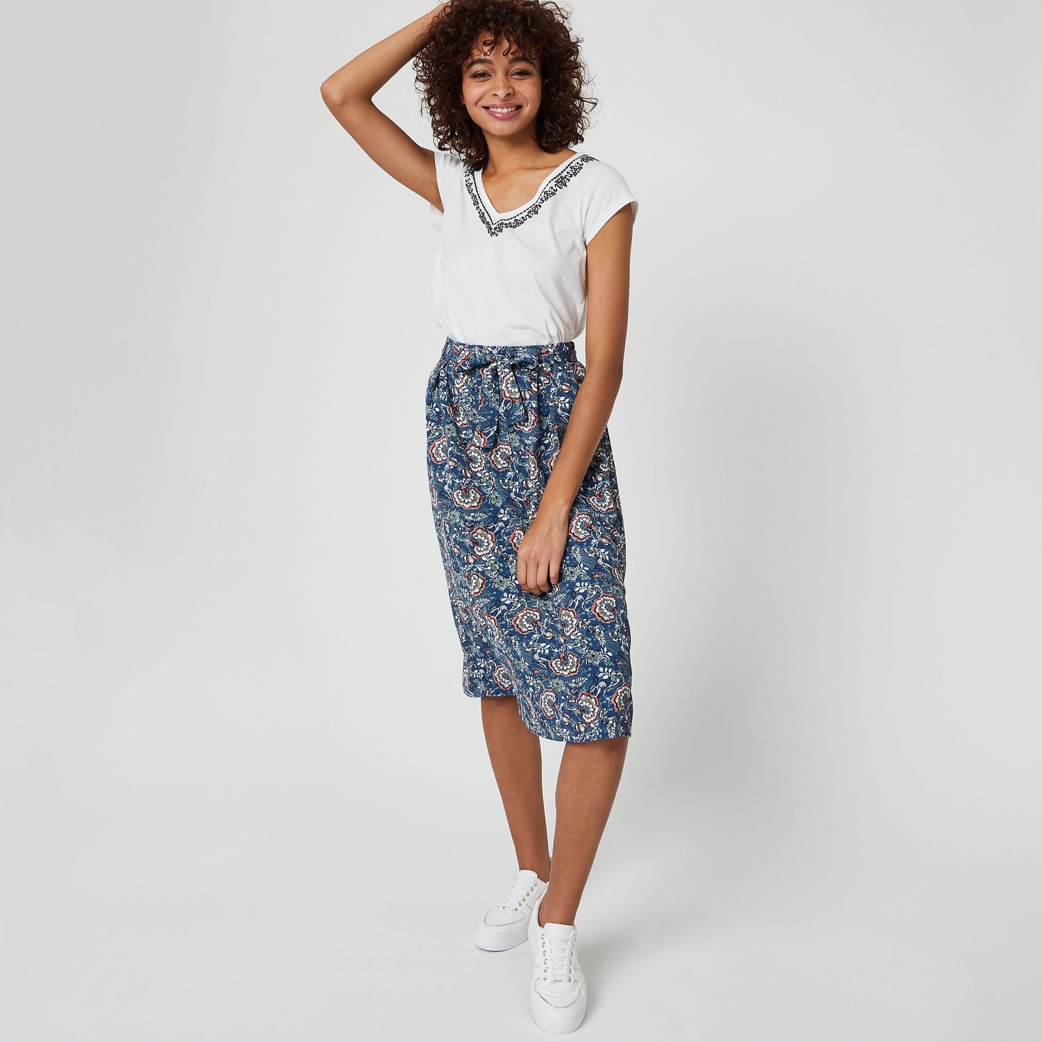 En savoir +Jupe midi avec un imprimé fantaisie très estival pour vous balader sur la plage, au marché, et pourquoi pas au bureau ?