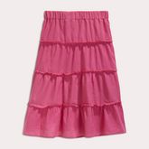 On aime la teinte 100% fille et la légèreté de cette jupe longue ! Réalisée en voile pur coton, agréable à porter. Doublure en voile de coton. Ceinture élastiquée facilitant l'habillage. Petits volants cousus sur la jupe. Cette jupe longue enfant est lavable en machine à 30°.