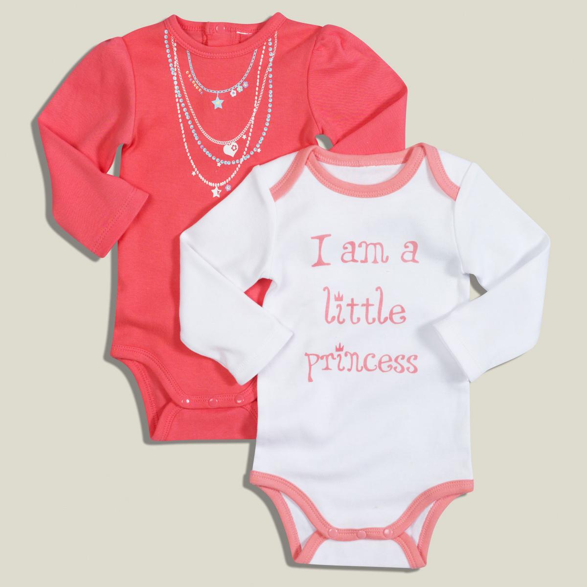 On craque pour ce lot de 2 bodies bébé fille plein de fantaisie. 100% coton. Agréables à porter. 1 body avec ouverture pressionnée en haut du dos, impression colliers, petites fronces sur les épaules. 1 body avec emmanchures américaines, inscription sur le devant. Manches longues. Ce lot de 2 bodies
