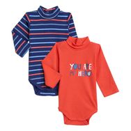 Les bodies bébé ne se cachent plus ! Lot de 2 bodies sous pulls garçon. Toucher doux. Confort assuré. Col roulé pour avoir bien chaud, manches longues. Ouverture pressionnée pratique à mi-dos. Pressions à l'entrejambe. 1 rayé et 1 avec imprimé sur le devant. Ce lot de 2 bodies sous pulls garçon