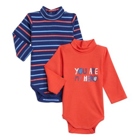 Les bodies bébé ne se cachent plus ! Lot de 2 bodies sous pulls garçon. Toucher doux. Confort assuré. Col roulé pour avoir bien chaud, manches longues. Ouverture pressionnée pratique à mi-dos. Pressions à l'entrejambe. 1 rayé et 1 avec imprimé sur le devant. Ce lot de 2 bodies sous pulls garçon