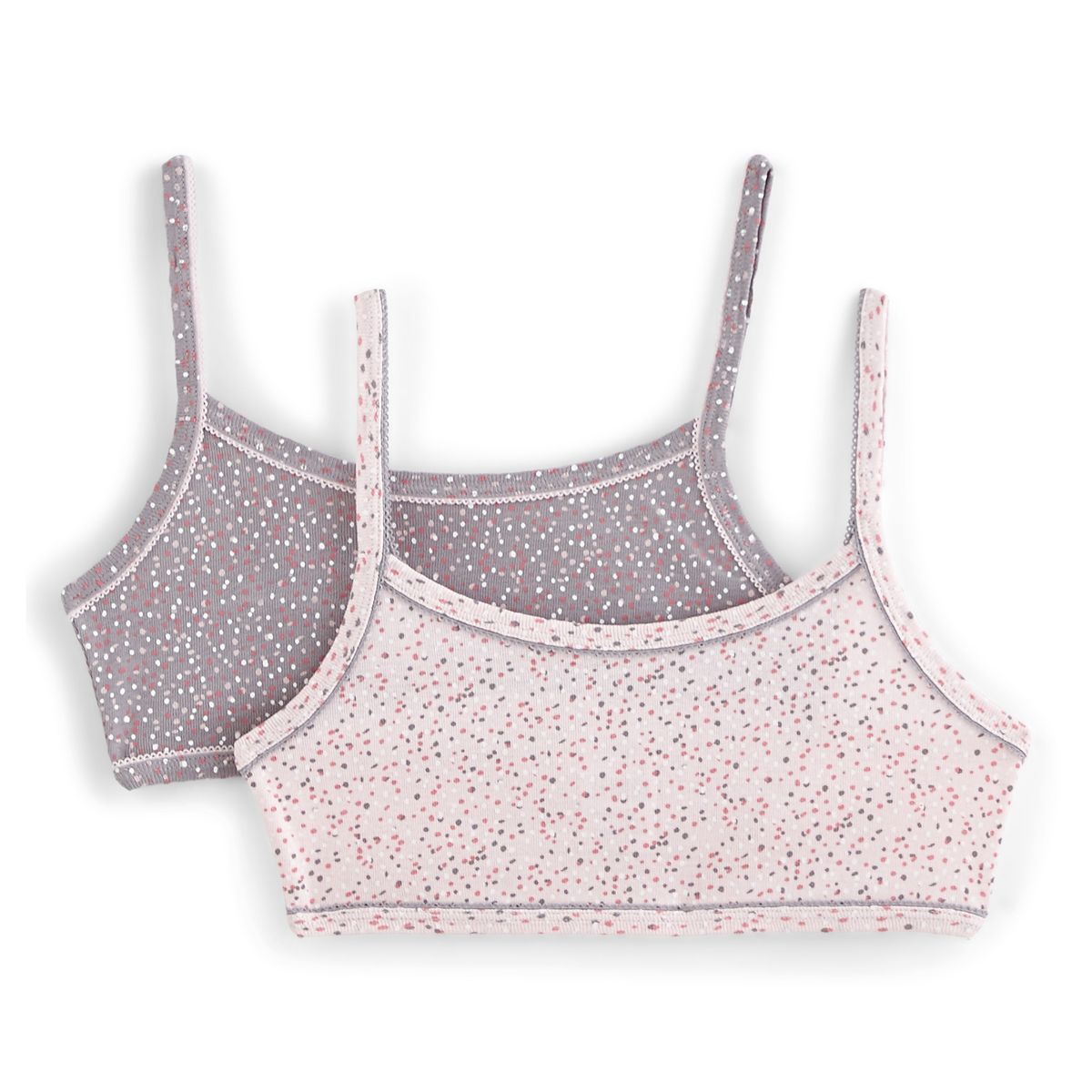 Les filles ajoutent sans hésiter à leur dressing ces 2 brassières à fines bretelles et à l'imprimé graphique tout doux ! Elles aiment : la matière douce et extensible ainsi que les délicates finitions picots. Ces 2 brassières fille sont parfaites pour tous les jours.