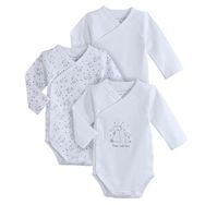 On craque pour ce lot de 3 bodies naissance faciles à enfiler et adorables ! Confortables. 100% coton. Forme cache-cœur avec ouverture pressionnée sur les côtés. Manches longues. Pressions à l’entrejambe. Ce lot de 3 bodies croisés bébé associe 1 body uni, 1 body imprimé en all-ove