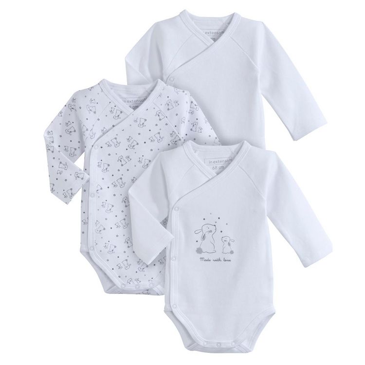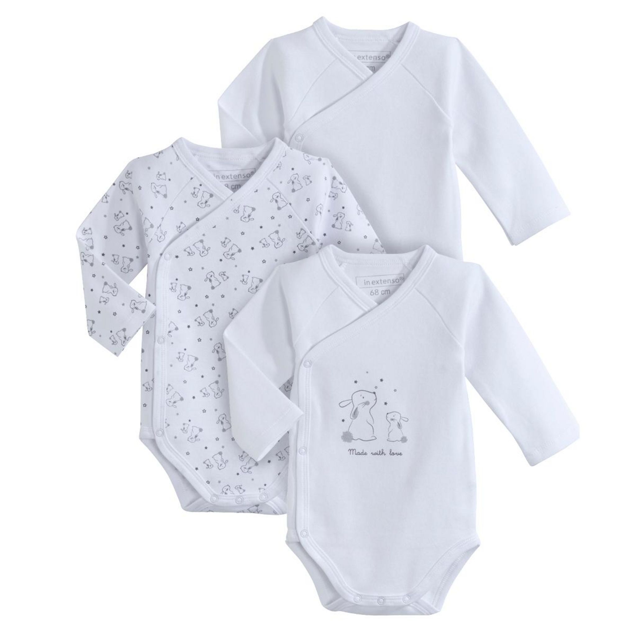 En savoir +On craque pour ce lot de 3 bodies naissance faciles à enfiler et adorables ! Confortables. 100% coton. Forme cache-cœur avec ouverture pressionnée sur les côtés. Manches longues. Pressions à l’entrejambe. Ce lot de 3 bodies croisés bébé associe 1 body uni, 1 body imprimé en all-over et 1 body avec motif sur le devant.
