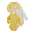 Lot de 3 bodies naissance à manches longues : faciles à enfiler et couleurs fraiches. Agréables à porter. 100% coton. Forme cache-cœur avec ouverture pressionnée sur les côtés. Pressions à l’entrejambe. Ce lot de 3 bodies croisés bébé associe 2 bodies imprimés et 1 body avec motif sur le devant.