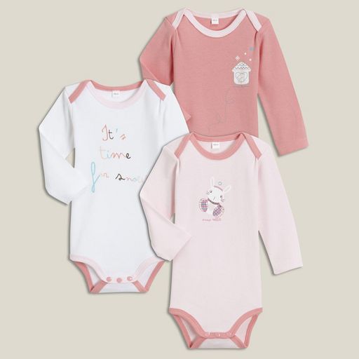 Vêtements indispensables pour bébé : le lot de 3 bodies manches longues. 100% coton, doux et agréables à porter. Emmanchures américaines facilitant le passage de tête. Pressions à l'entrejambe. Motifs fantaisie. Ce lot de 3 bodies bébé fille est lavable en machine à 30°.