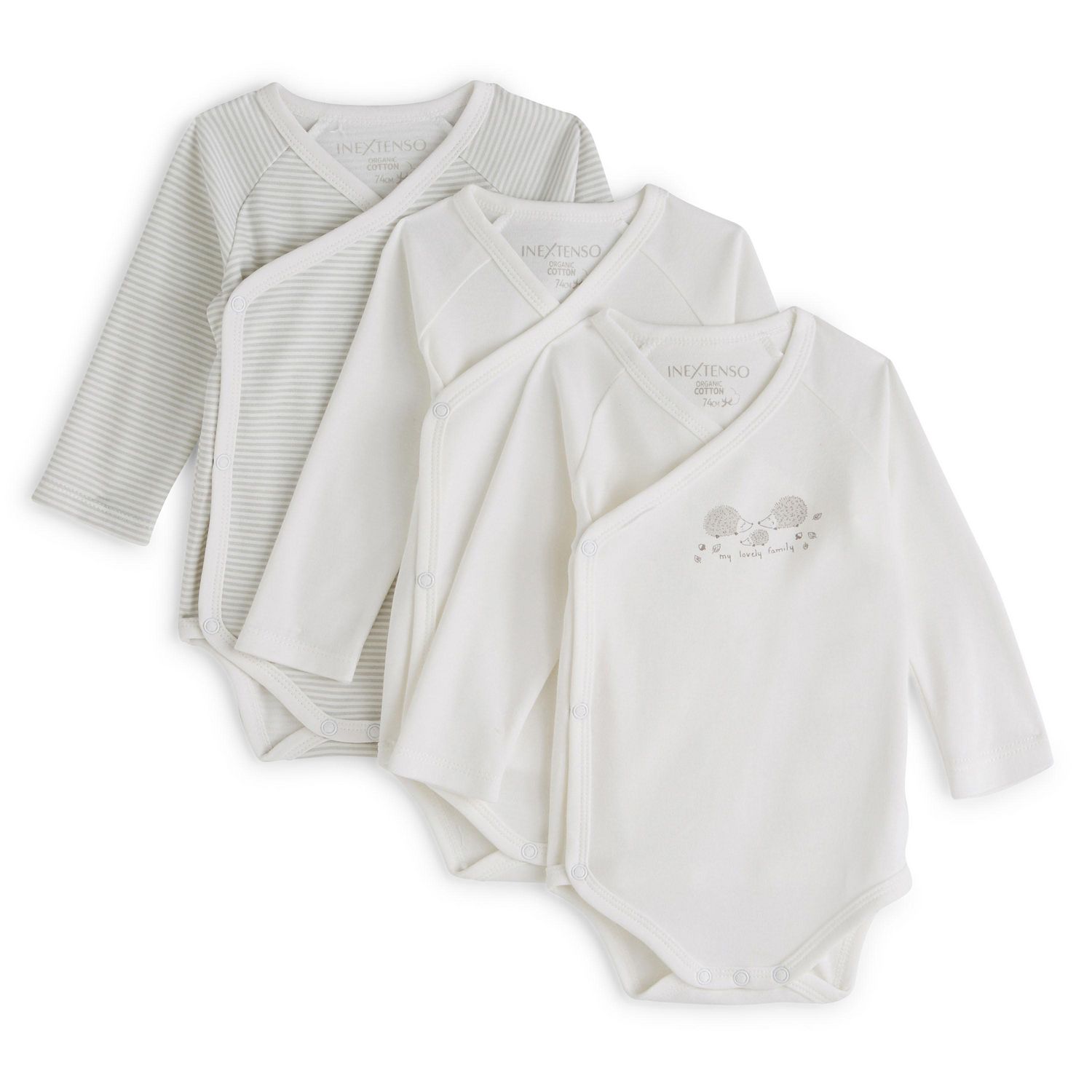 En savoir +Indispensables au confort de bébé, le body à manches longues en pur coton apporte un supplément de chaleur et de douceur. Ce lot de 5 bodies à manches longues est hyper craquant et idéal dès la naissance ! L’ouverture croisée pressionnée permet un change et un habillage facile même pour les tout petits bébés. Ce lot est composé d’un body écru uni, d’un body écru à motif famille d’hérissons placé devant et d’un body rayé.