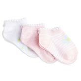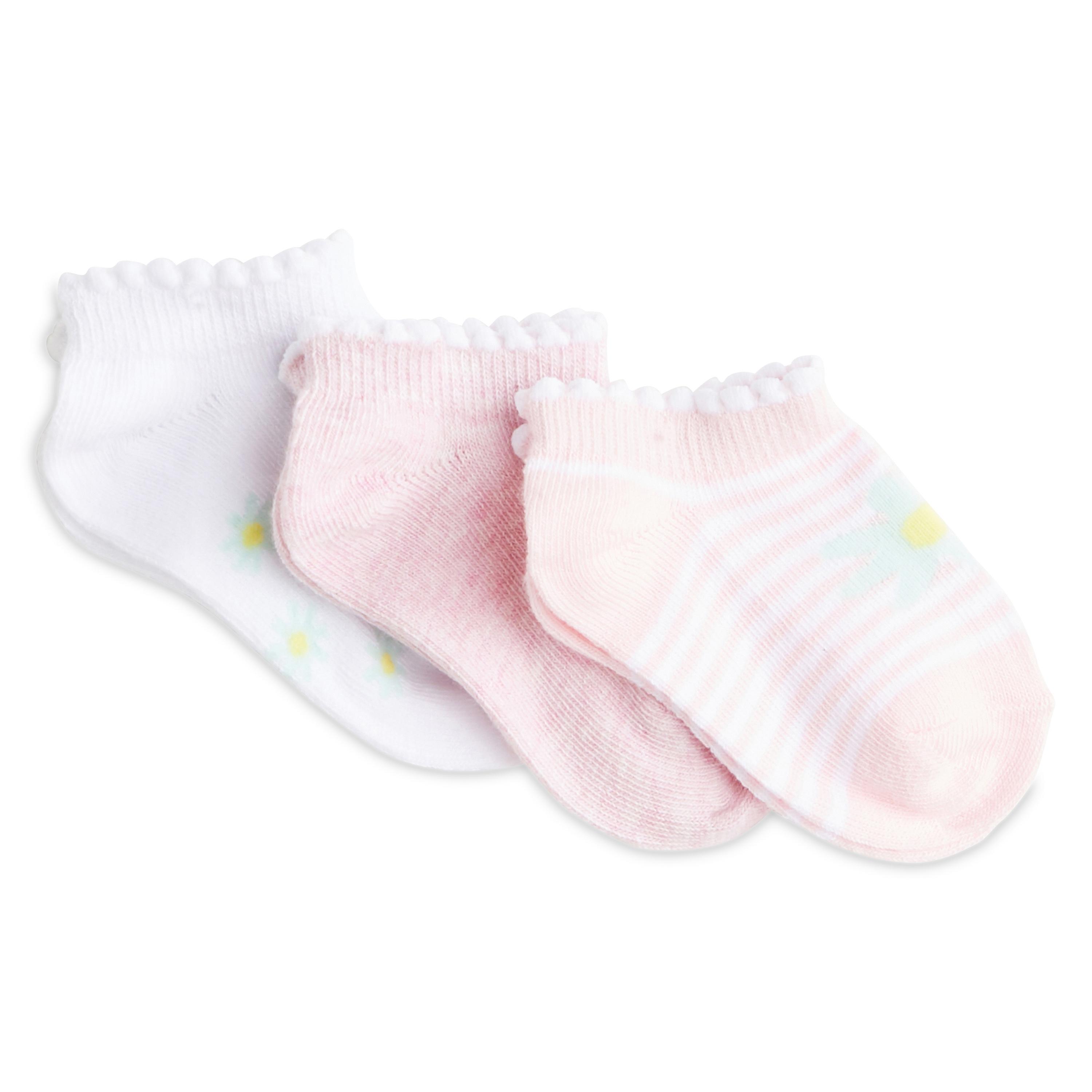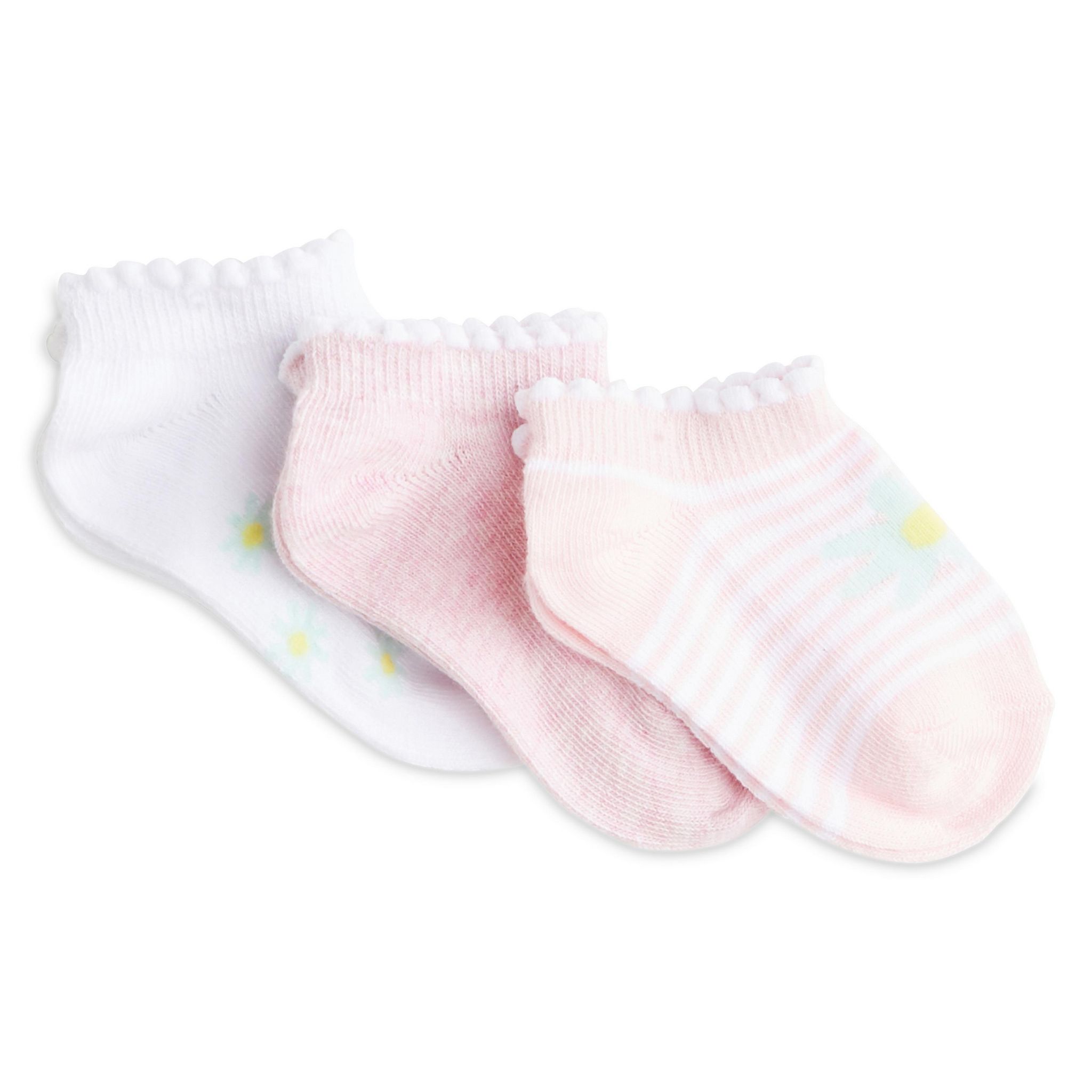 Conçues en coton biologique, ces 3 paires de socquettes mettent de la fantaisie dans les tenues de nos petites princesses ! On fond pour la finition en point cocotte à la cheville ! Le lot est composé de 1 paire de socquettes unies, d’une paire à imprimé marguerites, et d’une paire rayée
