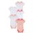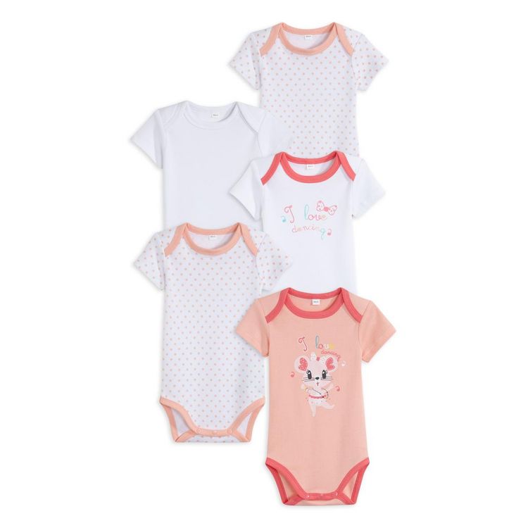 Lot de 5 bodies aux motifs et coloris tendres, parfait pour bébé. Agréables à porter. 100% coton. Emmanchures américaines, pratique pour habiller bébé. Entrejambe pressionné. Décors variés. Ce lot de 5 bodies manches courtes bébé fille est lavable en machine à 40°.
