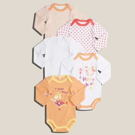 En savoir +Il est vraiment irrésistible ce lot de 5 bodies manches longues pour bébé ! 100% coton, doux et confortable. Emmanchures américaines facilitant le passage de tête. Pressions à l'entrejambe. 1 body avec motifs légèrement pailletés. Ce lot de 5 bodies bébé mixtes est lavable en machine à 40°.