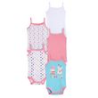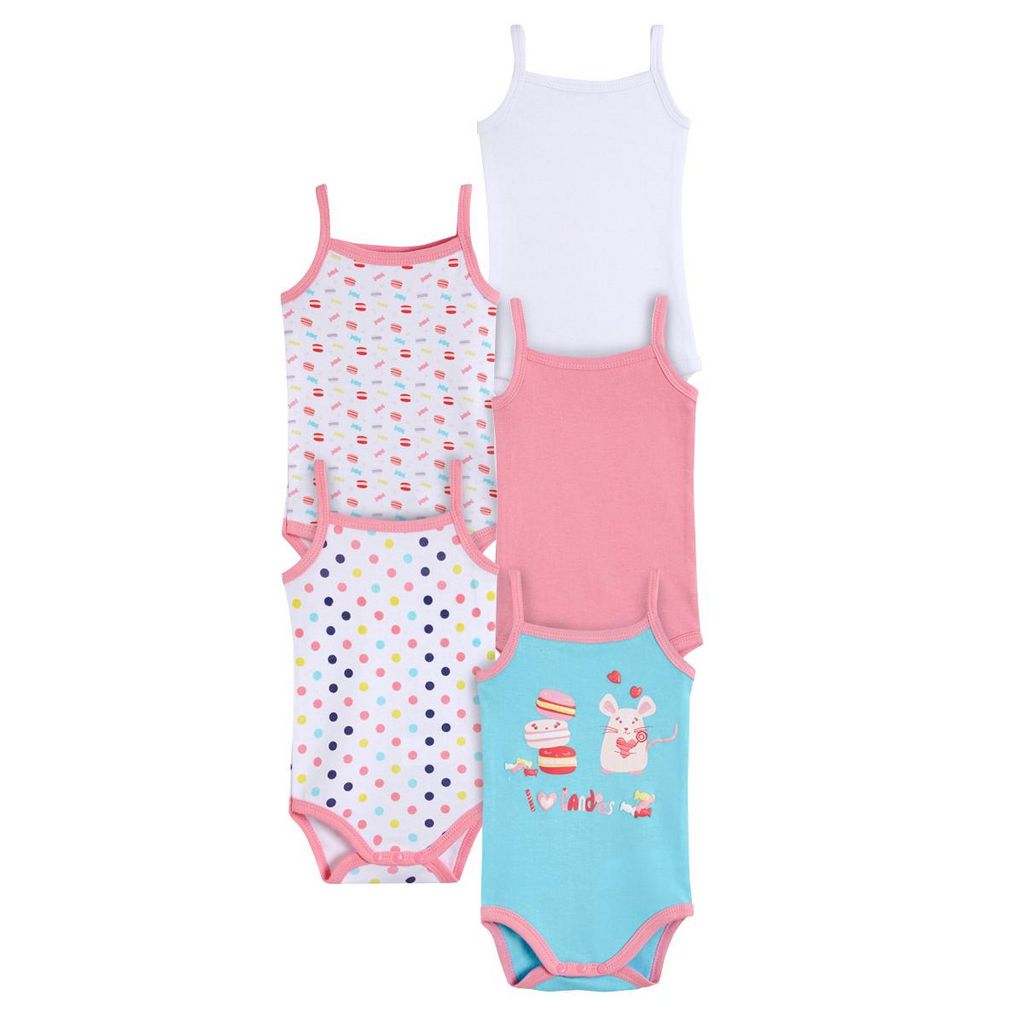 Les couleurs, les motifs, la matière toute douce... on craque totalement pour ce lot de 5 bodies bébé fille à fines bretelles. 100% coton. Agréables à porter. 3 imprimés (dont 1 avec très légères paillettes) et 2 unis. Pressions à la base pour habiller facilement bébé. Ce lot de 5 bodies été