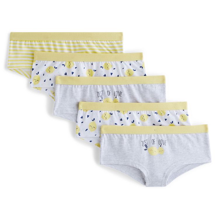 Très agréables à porter, ces shorties ont une forme bien emboîtante parfaite pour le confort des filles actives. Ce lot de 5 shorties possèdent une large taille élastiquée colorée et de tendres motifs acidulés.